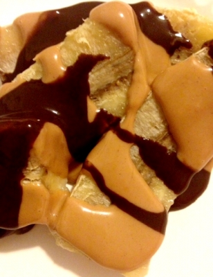 3. Drizzle the peanut butter and chocolate sauce over the banana