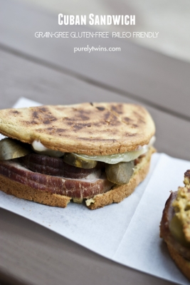 Gluten-free grain-free sandwich bread used to make a ham and cheese sandwich. Add mustard, pickles and cheese and you have a healthy Cuban sandwich made from real ingredients.