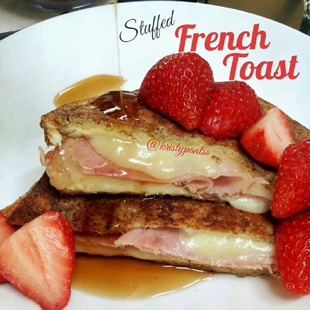 French toast 'stuffed' with extra lean ham and havarti. The 'stuffed' part is a bit of a cheat, as its essentially just dipping and cooking a ham & cheese sandwich French toast style ;) First make sandwich, then dipp it in a mixture consisting of 1 egg white, 1 whole egg, 1t of vanilla, 1T of milk, a generous sprinkling each of cinnamon and nutmeg. Served here with strawberries and Canadian maple syrup!